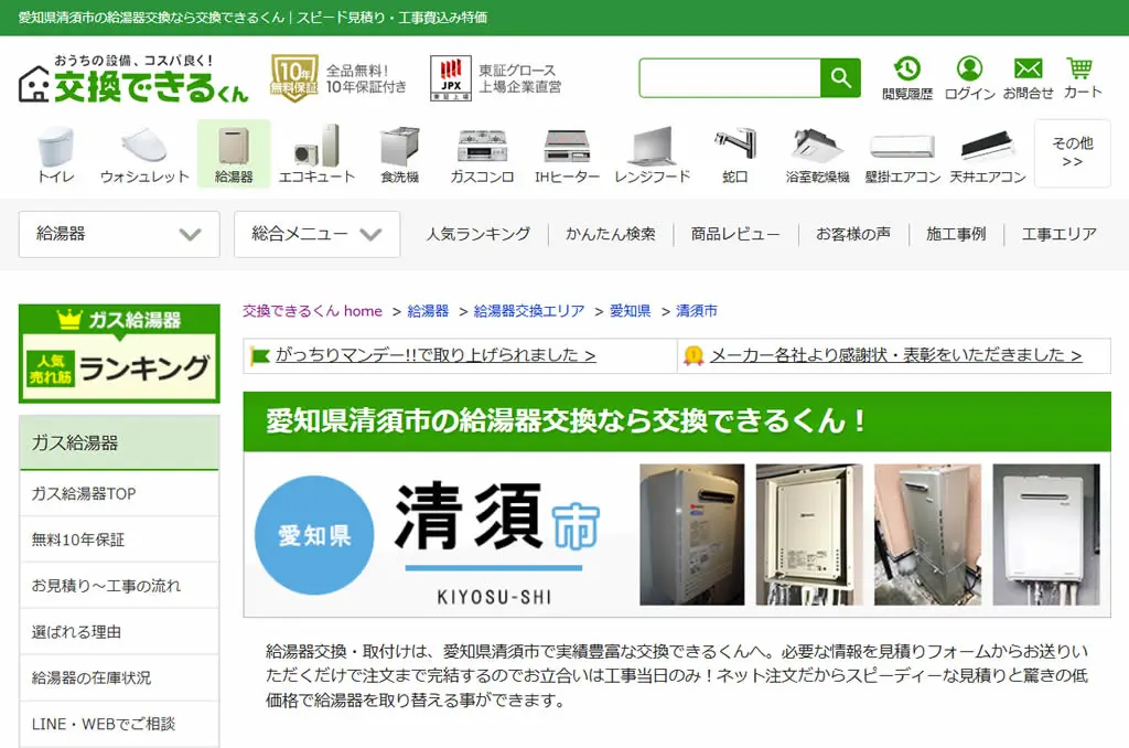 2025年5月にガス給湯器174機種の価格を平均17,035円値下げしており、交渉なしでの低価格を強みとしています。