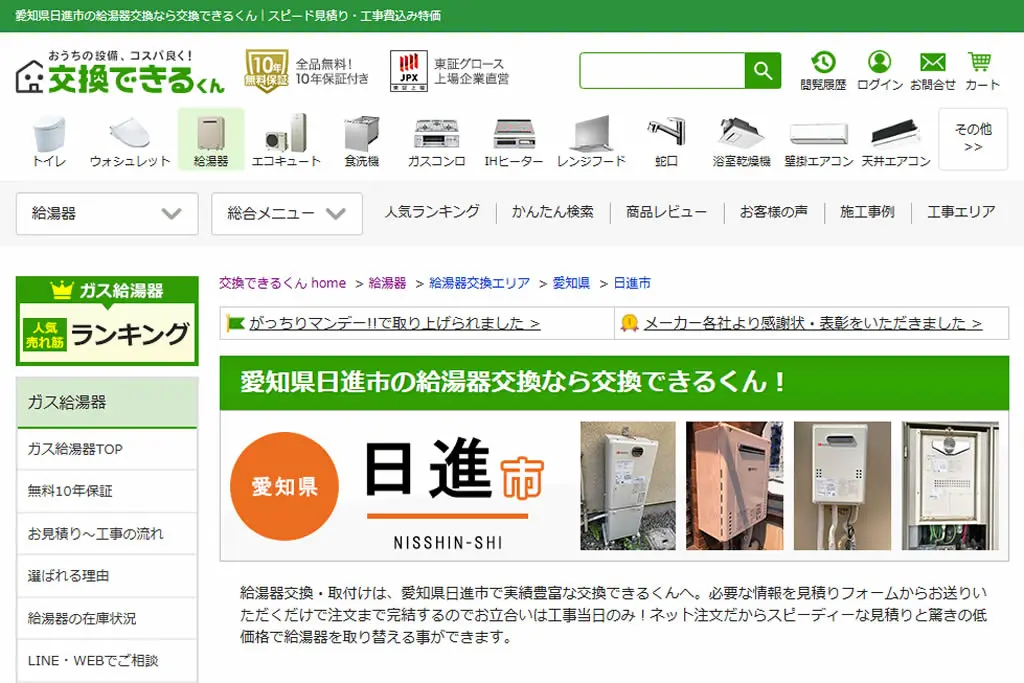 2025年5月にガス給湯器174機種の価格を平均17,035円値下げしており、交渉なしでの低価格を強みとしています。