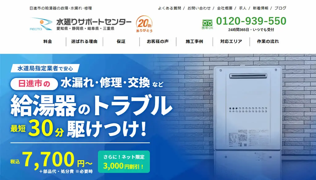 24時間365日年中無休で、名古屋市や豊田市、岡崎市など一部エリアは最短即日対応です。早朝や夜間の給湯器トラブルにも対応してもらえるので心強いです。