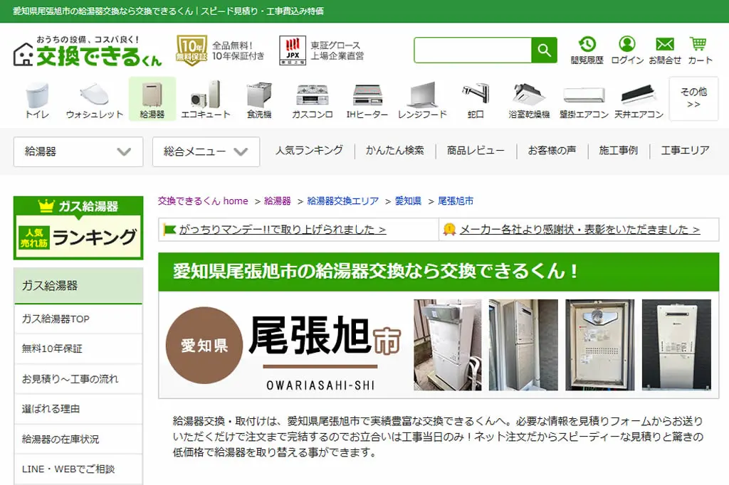 2025年5月にガス給湯器174機種の価格を平均17,035円値下げしており、交渉なしでの低価格を強みとしています。