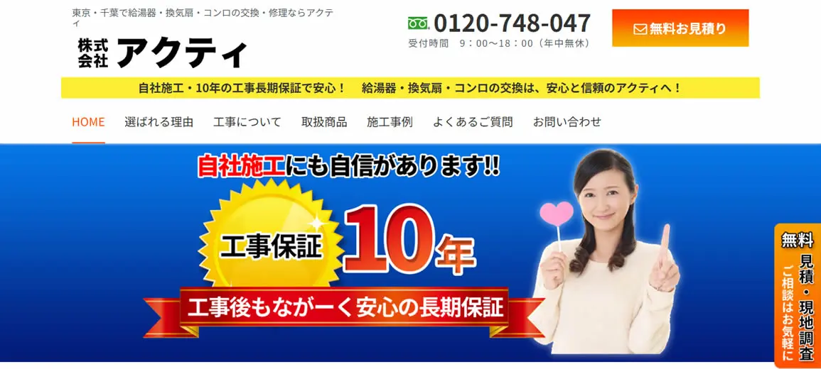 電話、WEB問わず見積もり受付は24時間365日対応。電話なら最短30分で訪問可、即日施工も可能なので、「給湯器のお湯が出ない」といった緊急性の高いトラブル時に頼りになるでしょう。