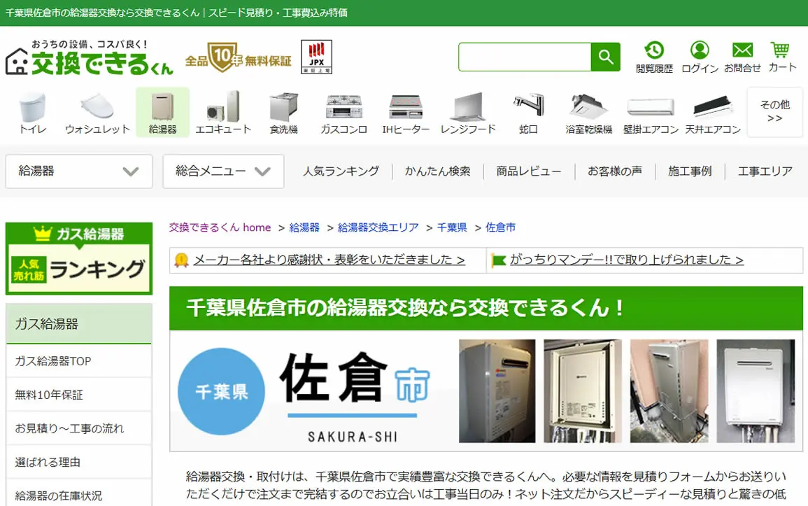 2025年5月にガス給湯器174機種の価格を平均17,035円値下げしており、交渉なしでの低価格を強みとしています。