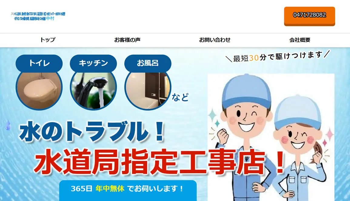 | 運営会社 | トイレ詰まり、排水管・排水マスのつまり、高圧洗浄、蛇口・水栓・シャワー・水まわり・水道管・井戸ポンプの水漏れ修理、給湯器交換の近くの水道屋 中村 |