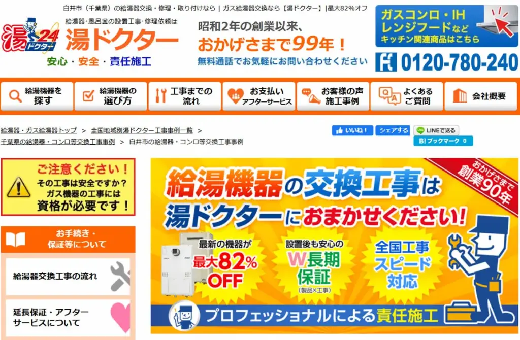 ガス給湯器が最大92%オフになるので、工事費用を抑えたい方に最適です。千葉県全域に対応しており、即日対応が可能なので、「給湯器にエラーコードが出た」などのトラブルも迅速に解決できます。