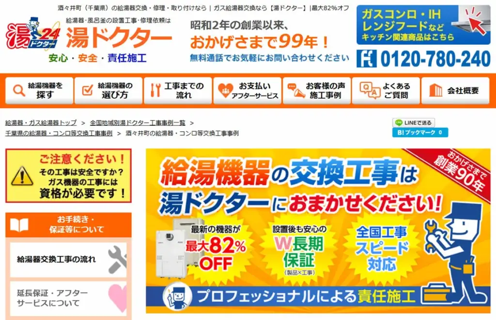 ガス給湯器が最大92%オフになるので、工事費用を抑えたい方に最適です。千葉県全域に対応しており、即日対応が可能なので、「給湯器にエラーコードが出た」などのトラブルも迅速に解決できます。