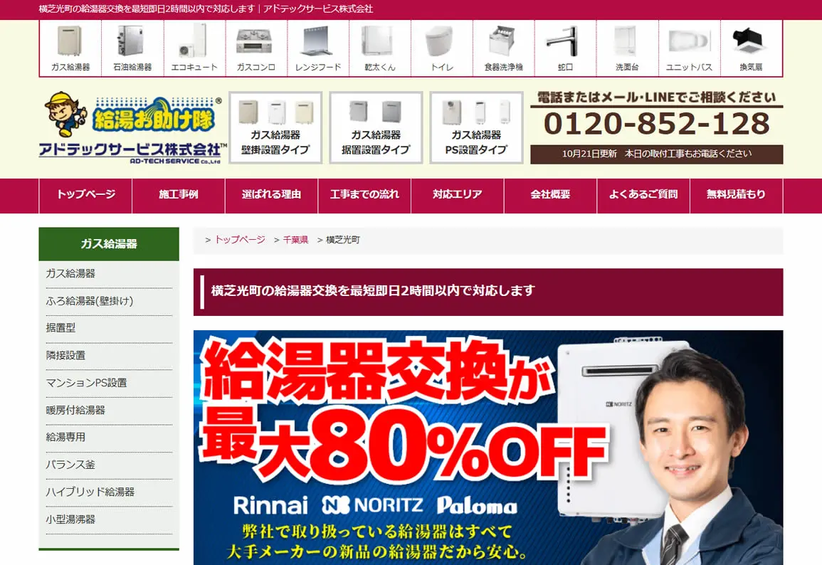 ガス給湯器が最大92%オフになるので、工事費用を抑えたい方に最適です。千葉県全域に対応しており、即日対応が可能なので、「給湯器にエラーコードが出た」などのトラブルも迅速に解決できます。