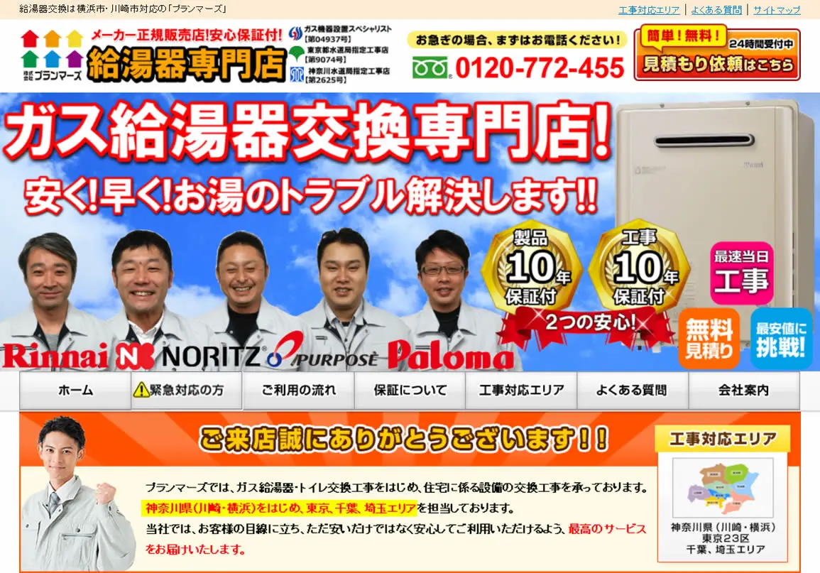 給湯器三大メーカーのリンナイ・ノーリツ・パロマの正規販売店なので、給湯器交換が初めての方でも安心して依頼できます。