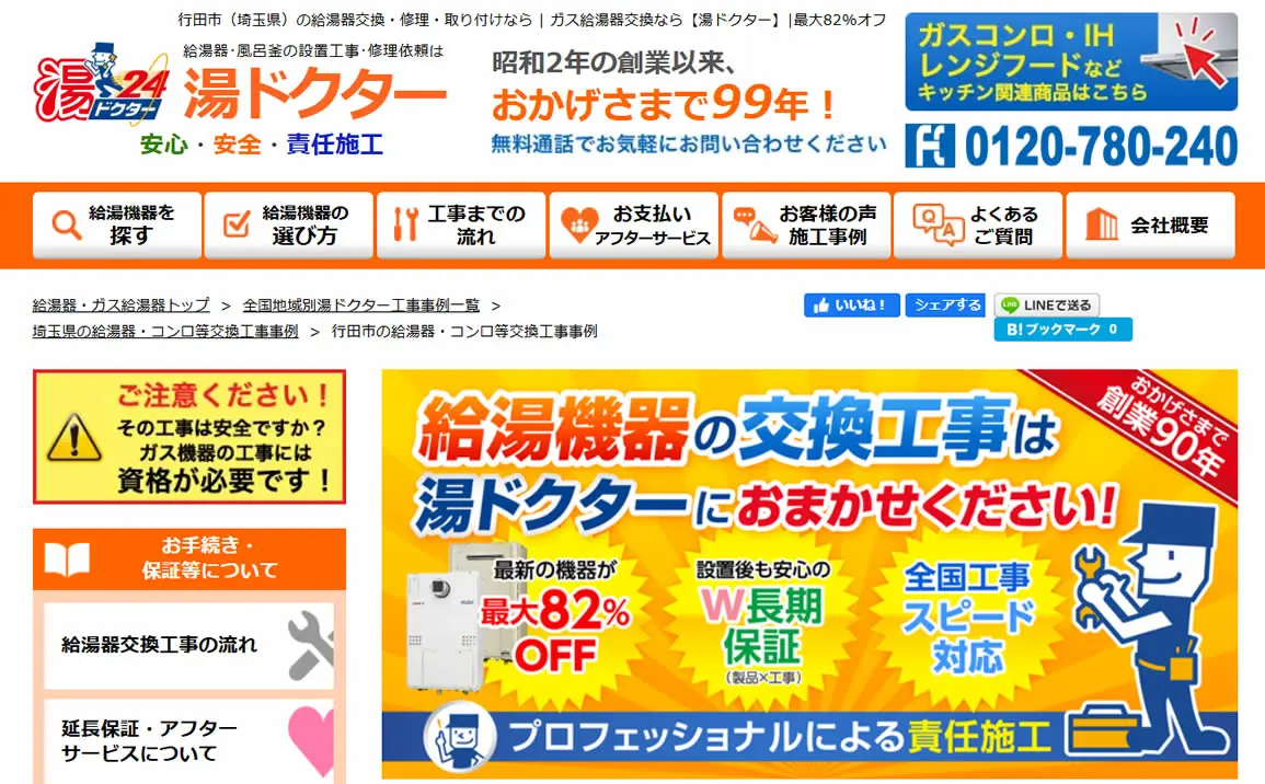 ガス給湯器が最大92%オフになるので、工事費用を抑えたい方に最適です。埼玉県全域に対応しており、即日対応が可能なので、「給湯器にエラーコードが出た」などのトラブルも迅速に解決できます。