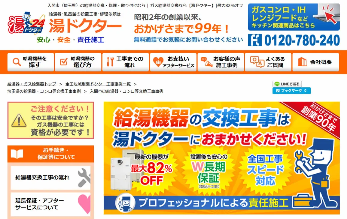 ガス給湯器が最大92%オフになるので、工事費用を抑えたい方に最適です。埼玉県全域に対応しており、即日対応が可能なので、「給湯器にエラーコードが出た」などのトラブルも迅速に解決できます。