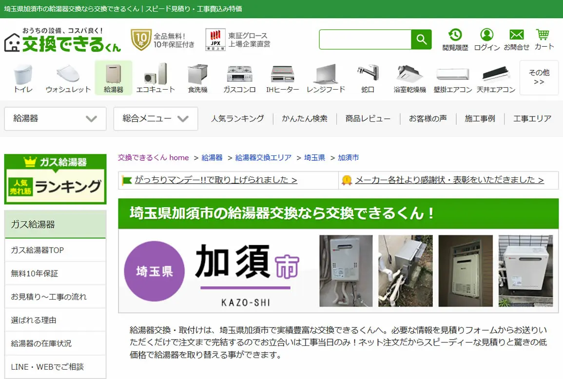 2025年5月にガス給湯器174機種の価格を平均17,035円値下げしており、交渉なしでの低価格を強みとしています。