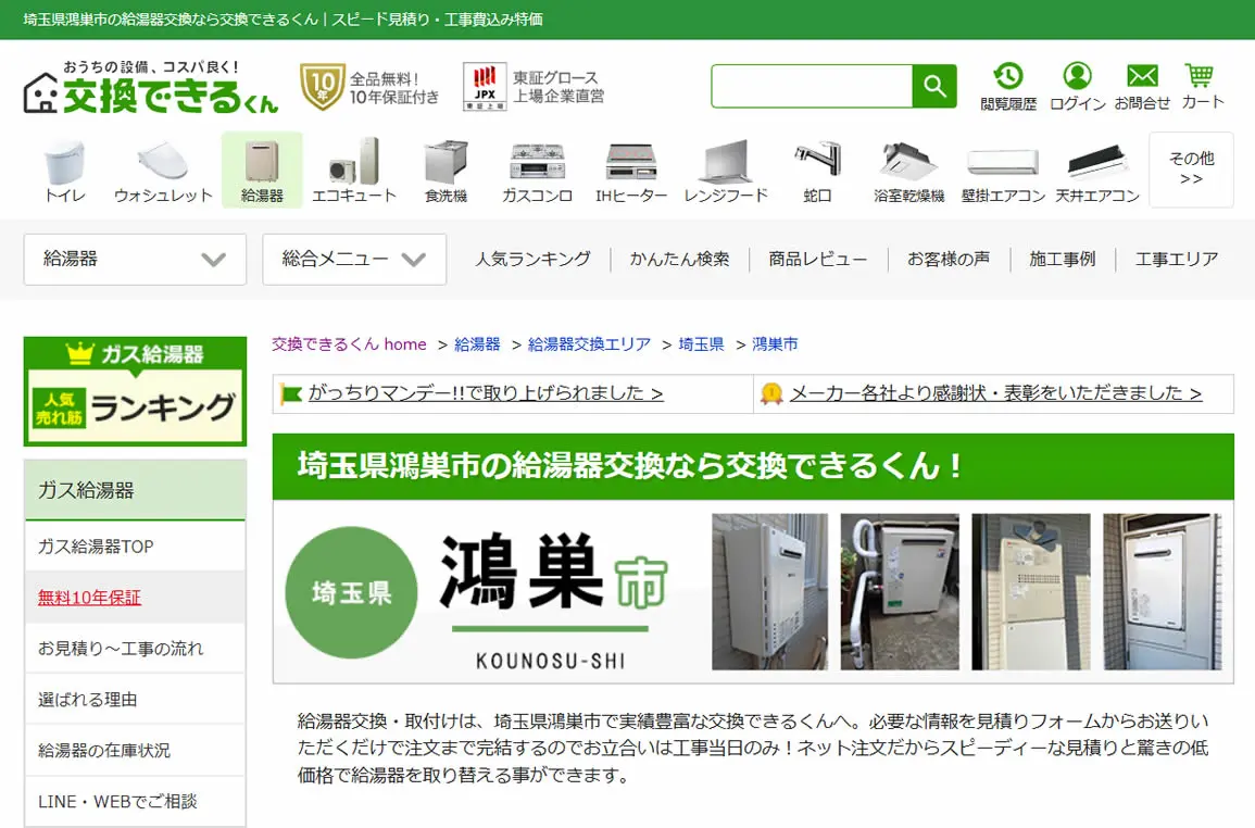 2025年5月にガス給湯器174機種の価格を平均17,035円値下げしており、交渉なしでの低価格を強みとしています。