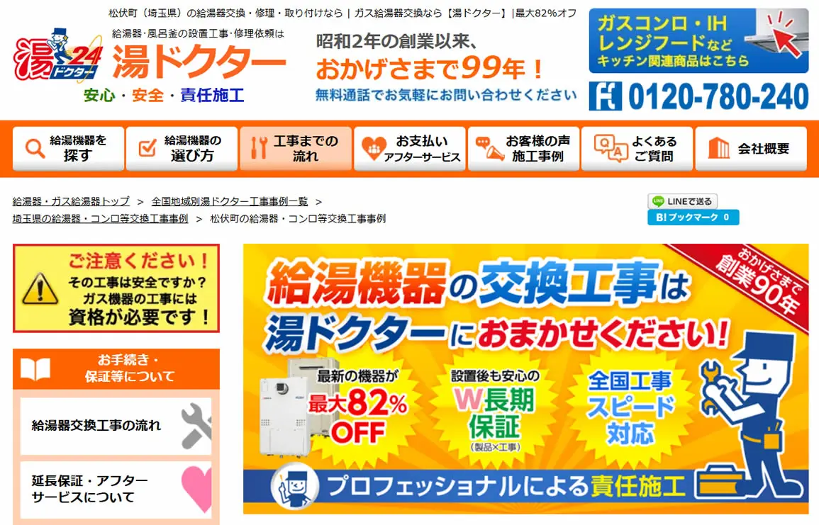 ガス給湯器が最大92%オフになるので、工事費用を抑えたい方に最適です。埼玉県全域に対応しており、即日対応が可能なので、「給湯器にエラーコードが出た」などのトラブルも迅速に解決できます。