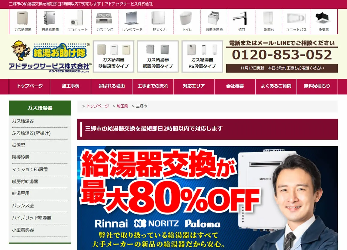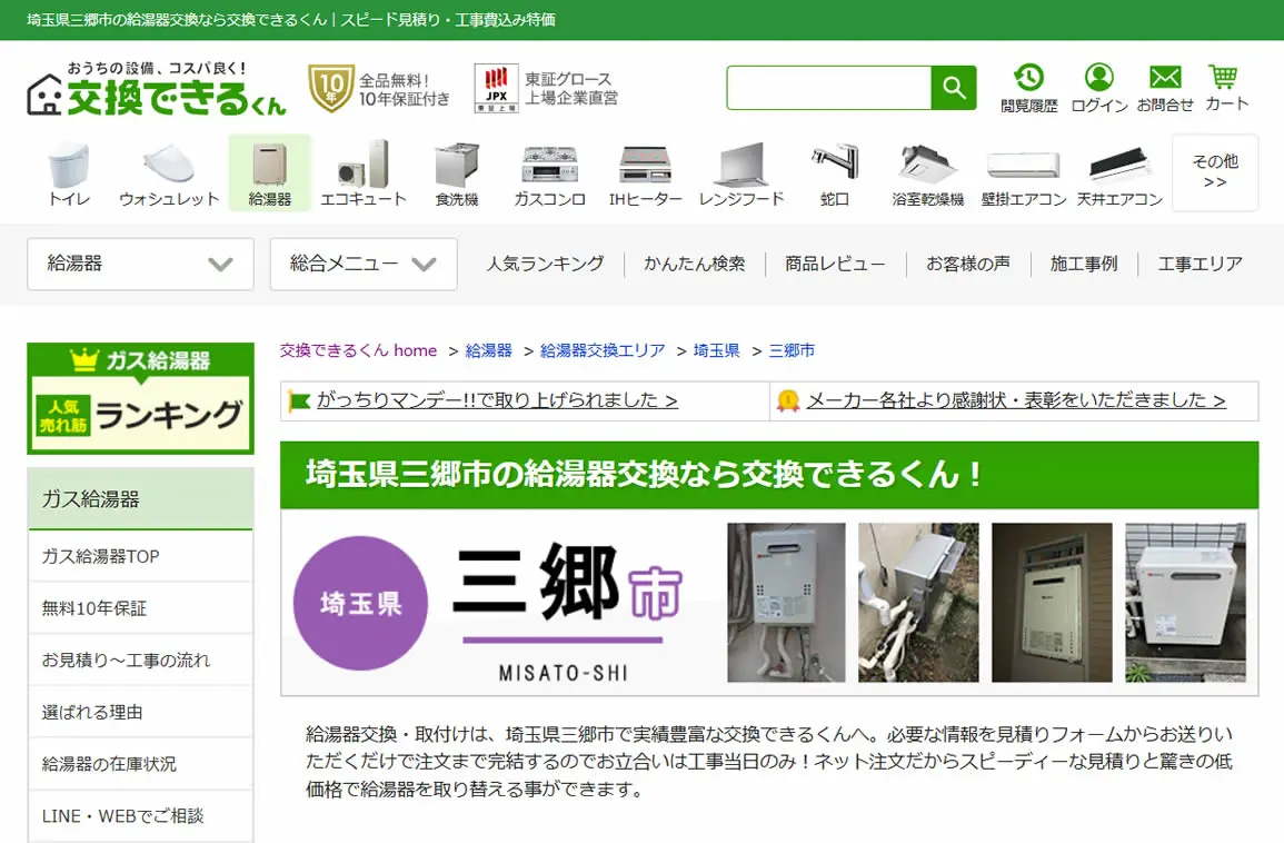 2025年5月にガス給湯器174機種の価格を平均17,035円値下げしており、交渉なしでの低価格を強みとしています。