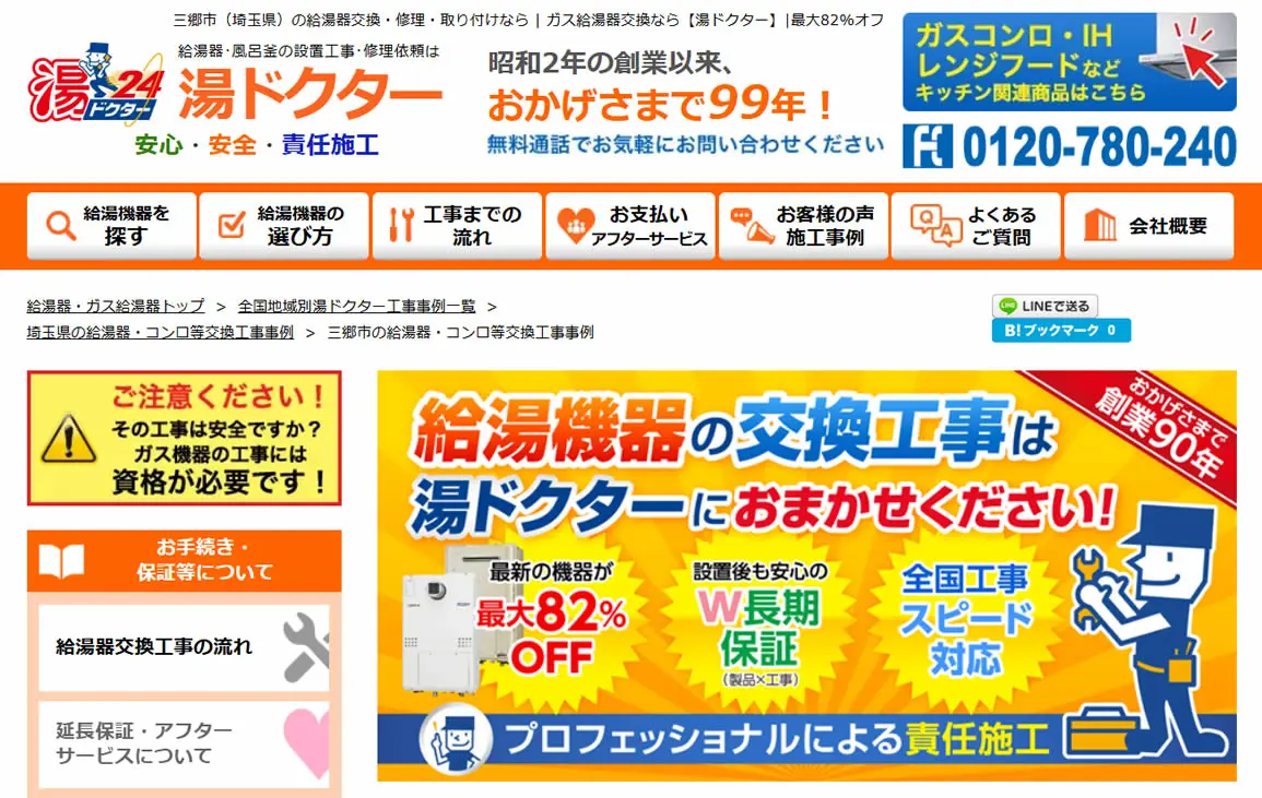 ガス給湯器が最大92%オフになるので、工事費用を抑えたい方に最適です。埼玉県全域に対応しており、即日対応が可能なので、「給湯器にエラーコードが出た」などのトラブルも迅速に解決できます。