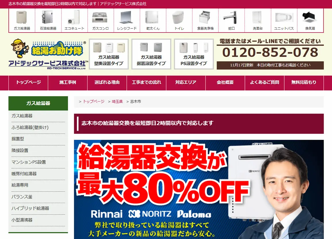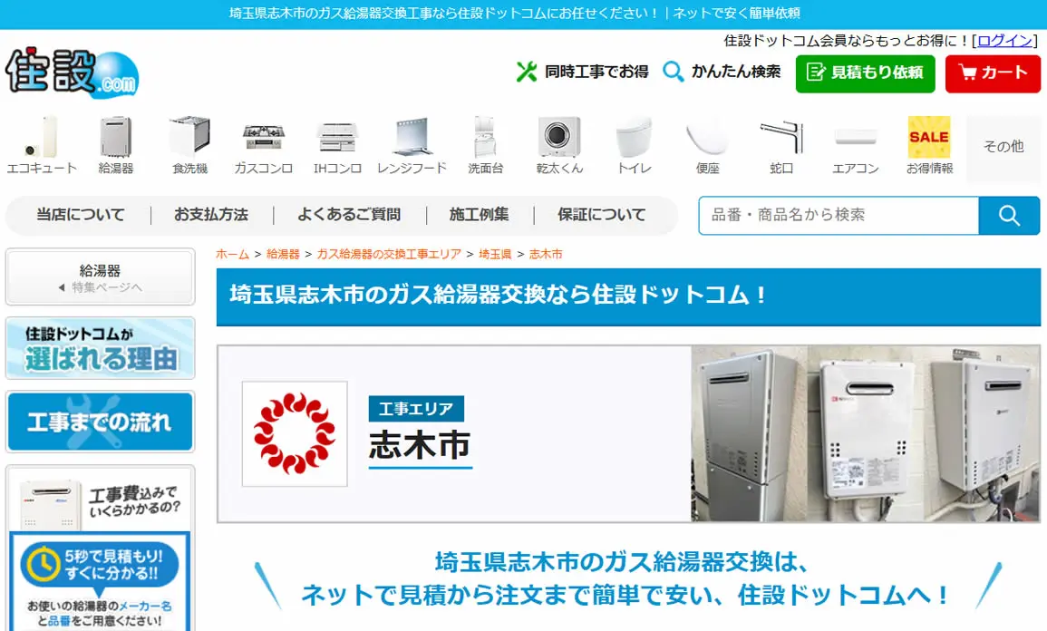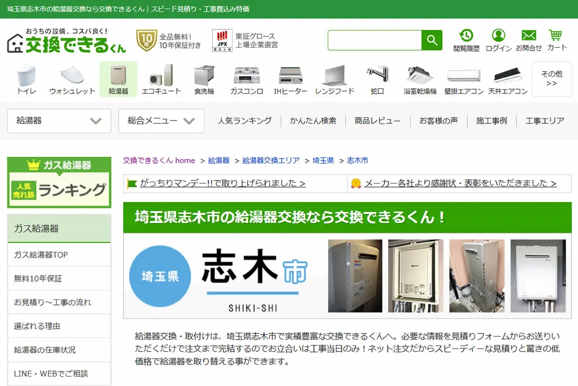 2025年5月にガス給湯器174機種の価格を平均17,035円値下げしており、交渉なしでの低価格を強みとしています。