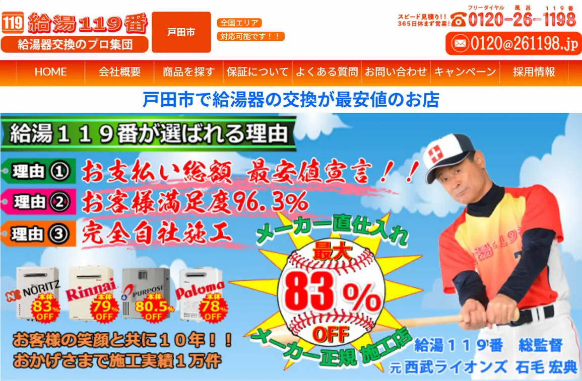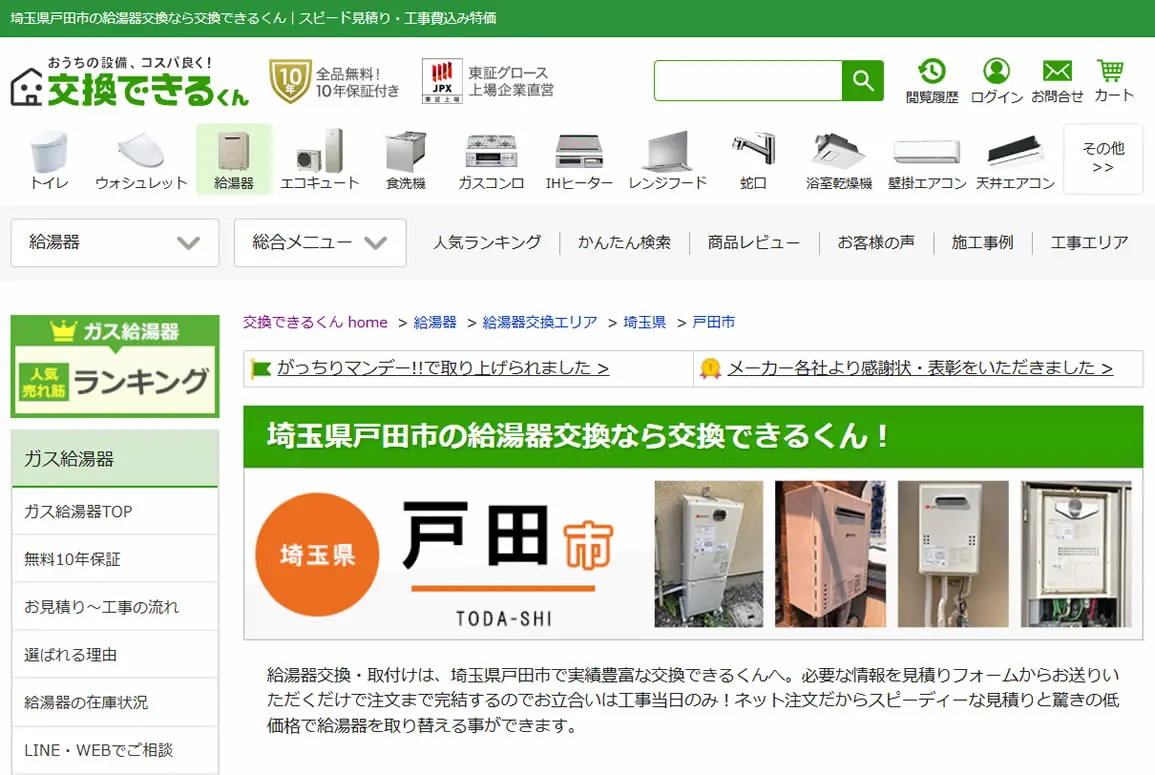 2025年5月にガス給湯器174機種の価格を平均17,035円値下げしており、交渉なしでの低価格を強みとしています。