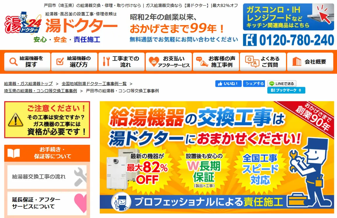 ガス給湯器が最大92%オフになるので、工事費用を抑えたい方に最適です。埼玉県全域に対応しており、即日対応が可能なので、「給湯器にエラーコードが出た」などのトラブルも迅速に解決できます。