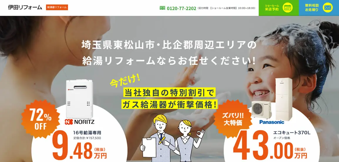 ガス給湯器が最大92%オフになるので、工事費用を抑えたい方に最適です。埼玉県全域に対応しており、即日対応が可能なので、「給湯器にエラーコードが出た」などのトラブルも迅速に解決できます。