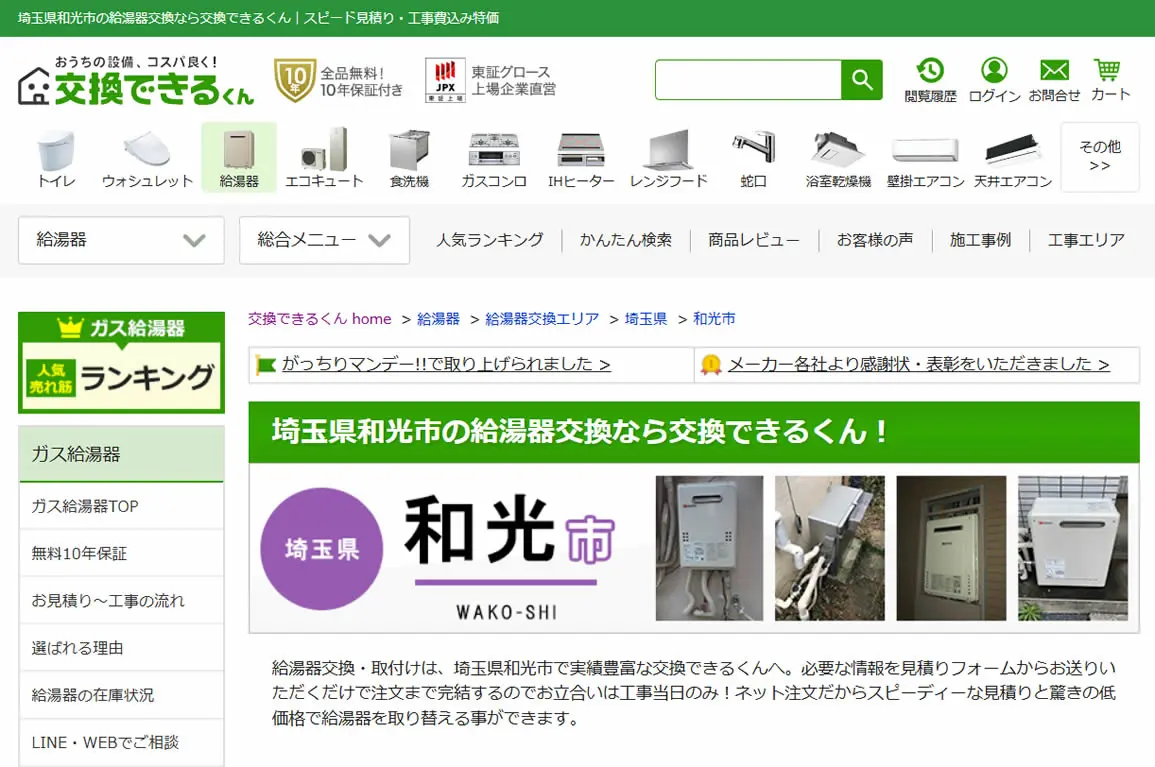 2025年5月にガス給湯器174機種の価格を平均17,035円値下げしており、交渉なしでの低価格を強みとしています。