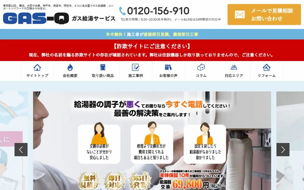 今すぐお湯を使いたい場合、対応スピードと在庫量が最重要です。東京都内で最短30分対応・即日交換が可能な給湯器駆けつけ隊をまず確認してください。